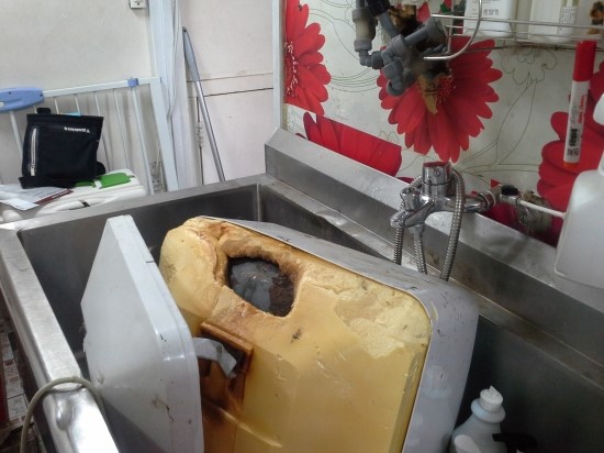 <설치전 기존 온수기가 노후 및 설치 불량으로 떨어져서 깨져있는 모습>